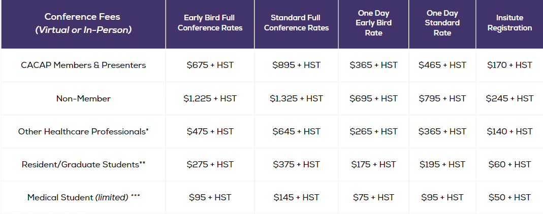 ** To be eligible for this rate, you need to provide evidence that you are in PGY1-6 or must have graduated less than a year ago from a Child and Adolescent Psychiatry program approved by the Royal College of Physicians and Surgeons of Canada. To apply, please contact kassaundra.richards@uottawa.ca and include your graduation certificate.