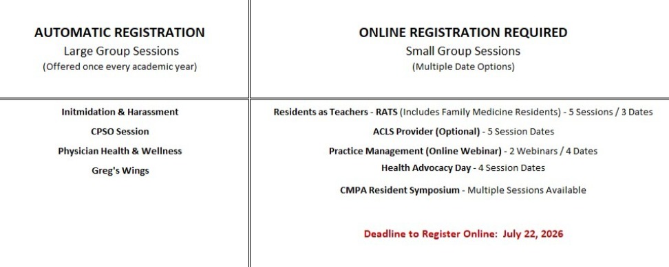 The only exception is for Family Medicine Residents, who are required to complete ONE Residents as Teachers (RATS) session, ONE CMPA Resident Symposia Series course, and in PGY-2 ONE Health Advocacy Session as part of the mandatory course requirements. No other session is required as mandatory, but are available as optional should you wish to register and attend. More specific information can be found on the PGY-1 tab above.