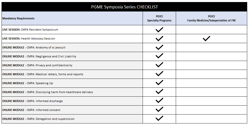 | Health Advocacy Day This session is new to the PGME Symposia Series Curriculum and mandatory for all PGY-2 programs including Family Medicine | 2025-2026 November 19, 2025 January 27, 2026 March 26, 2026 May 8, 2026 | Full Day (8:00 - 17:00) There will be 4 session dates to choose from and advance online registration will be required. The session will be a full day away from clinical duties. | Full Day In-person |